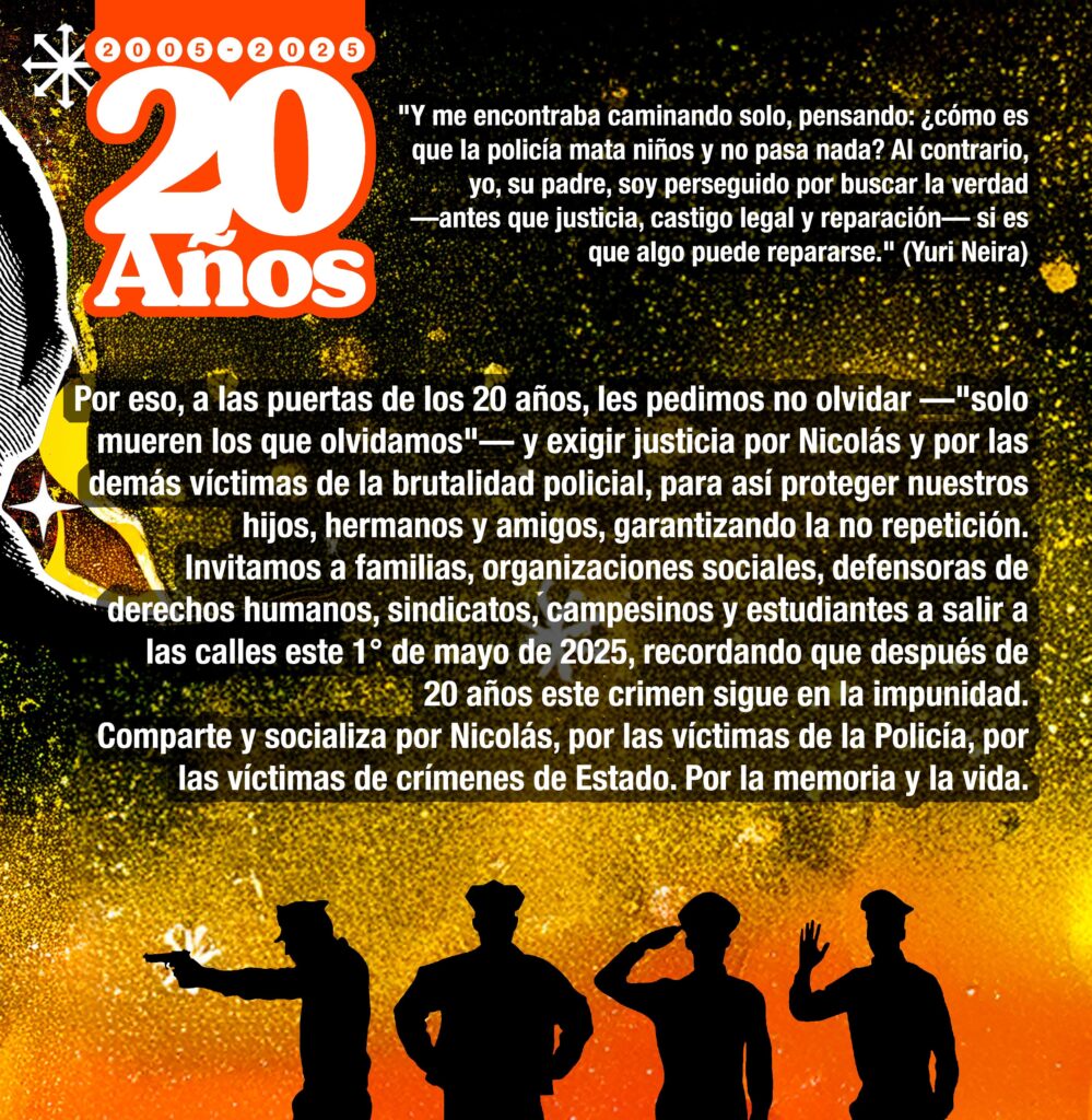 El 1° de mayo de 2025 se cumplen 20 años del asesinato de Nicolás Neira, quien con tan solo 15 años participaba en una manifestación pacífica cuando fue brutalmente agredido por miembros del Escuadrón Móvil Antidisturbios (ESMAD). Días después, falleció producto de las graves lesiones sufridas. Dos décadas han transcurrido y la impunidad sigue imperando en este caso emblemático de brutalidad policial. Dos décadas han transcurrido y vimos en nuestras pantallas con todo el cinismo de nuestro presente, la acción brutal del ESMAD contra jóvenes de Bogotá, Cali y Medellín en el Estallido Social. Con dolor, nos solidarizamos con todas las víctimas que han caído en manos del ESMAD y la Policía. Las calles aún gritan su nombre. Por todas ellas y su memoria, nuestra acción colectiva; por todas ellas y su memoria, nuestra acción permanente; por todas ellas, por nuestros hijxs y las generaciones venideras, hoy alzamos nuestros corazones en una sola voz que grita ¡No más brutalidad policial!»